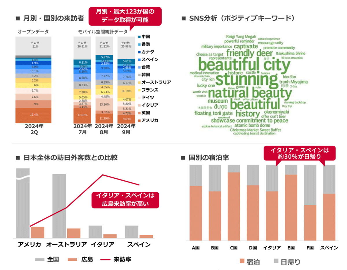 一般社団法人広島県観光連盟(以下 HIT)、学校法人早稲田大学(以下 早大)、株式会社インテージ(以下 インテージ) 、株式会社電通総研(以下 電通総研)、NTTコミュニケーションズ株式会社(以下 NTT Com)は、データを活用した観光マーケティングの実証実験(以下 本実証)を2025年3月より広島県で実施しており、先行してインバウンド観光客の動態把握を行いました。その結果、誘客と消費促進に向けた施策立案へのデータ利活用の有効性を確認できたため、2025年6月より国内観光客を対象とした取り組みに展開します。